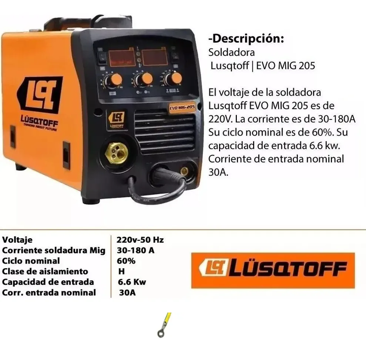 Tensión de entrada: 1 Ph AC 220 V ( ± 15%). • Frecuencia : 50 Hz • Capacidad de entrada nominal : 6,6 Kw • Corriente de entrada nominal: 30 A • Ciclo de trabajo MIG-MAG ( 45 ºC) (%): 139 A / 21 V @ 100% // 180 A / 23 V @ 60% • Ciclo de trabajo MMA ( 45 ºC) (%): 124 A / 25 V @ 100% // 160 A / 26,4 ...