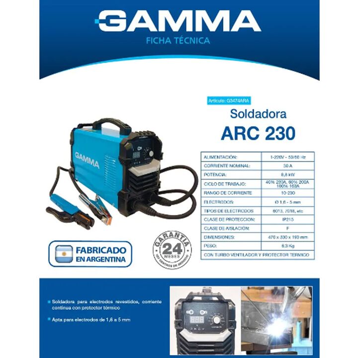 *Soldadora Inverter ARC 230 (Gamma G3474ARA) con rango de corriente de 10–230 A, apta para electrodos de 1,6 a 5 mm *Protección térmica y turbo ventilador para enfriamiento eficiente Usos: Ideal para trabajos en taller, construcción ligera, reparación metálica y bricolaje técnico.