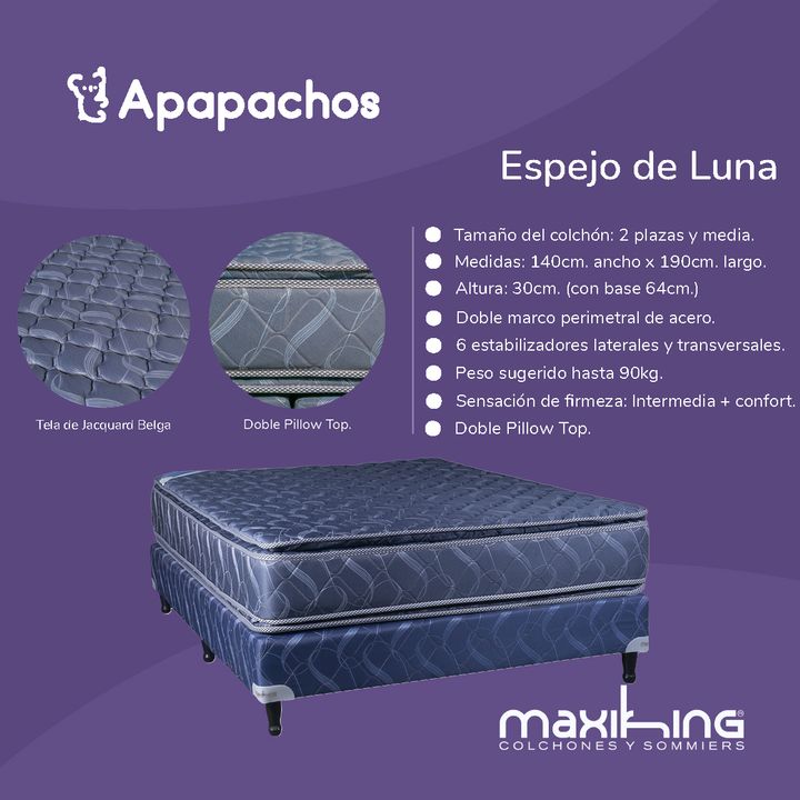 Sommier y Colchon Espejo de Luna 2 Plazas y Media 140x190x30 de Resortes Bonnell Doble Pillow de Jackard