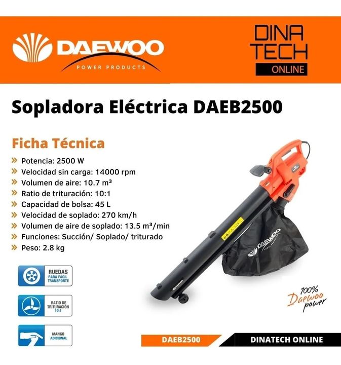Sopladora aspiradora Daewoo eléctrica 2500w 2.8 kg DAEB2500 Con tu sopladora Daewoo DAEB2500 podés eliminar la suciedad y mantener despejadas las áreas verdes, abiertas y otras zonas. Gracias a su calidad, limpia de manera práctica, efectiva y rápida una gran variedad de superficies. Disfrutá sus mu...