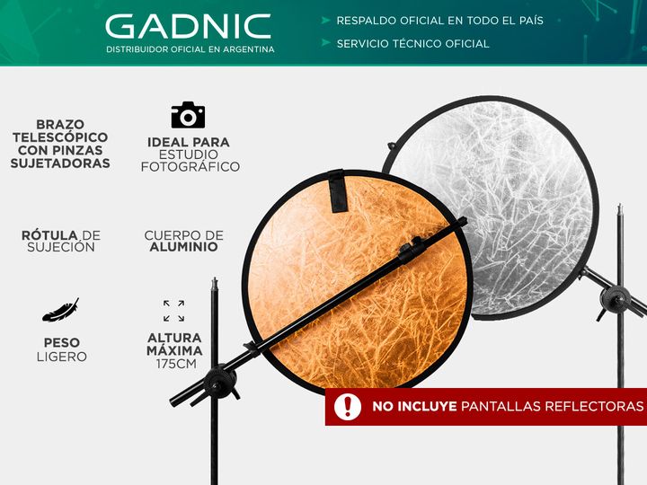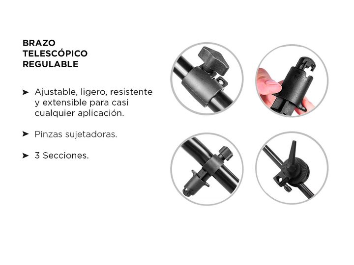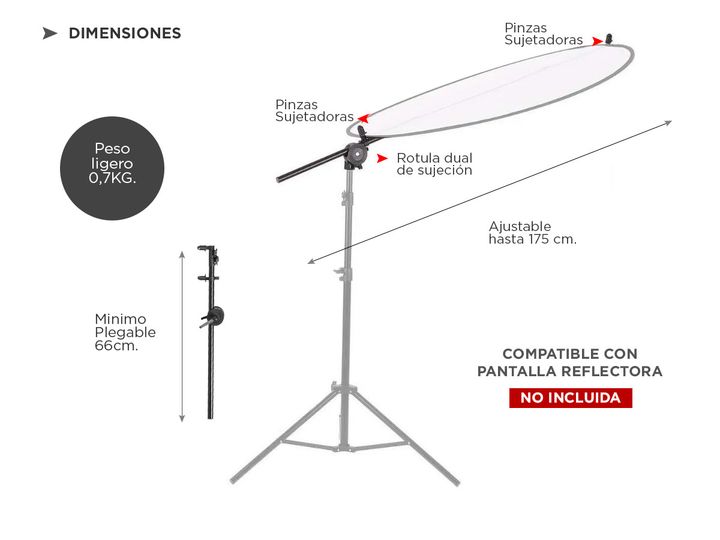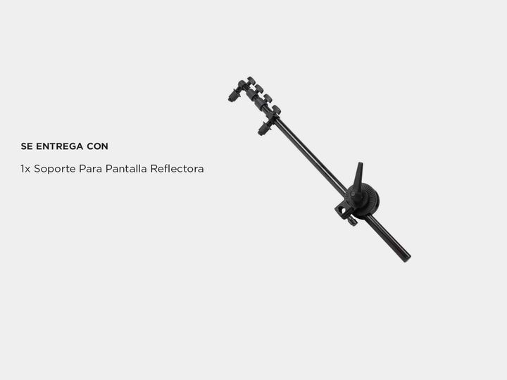 El soporte para pantallas reflectoras viene comprendido de un brazo telescópico con pinzas sujetadoras y una rotula dual de sujeción a trípodes de iluminación. El conjunto le brinda un sostén para pantallas reflectoras o fondos y le permite colocarlas exactamente donde lo necesita. Especificaciones ...