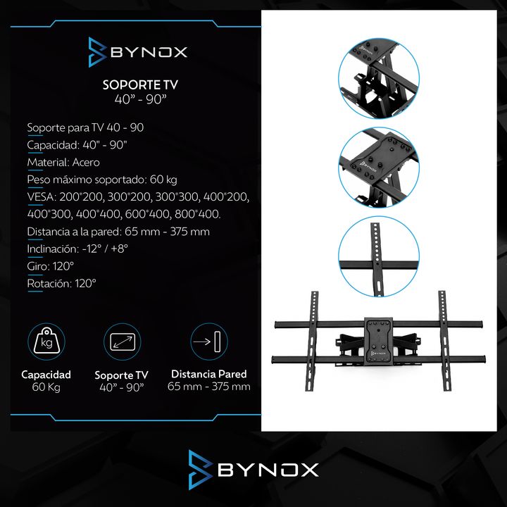Soporte TV Bynox articulado con brazo movil 40 a 90AI-SOPTVM-90 Soporte para TV 40 a 90 Material: Acero Peso máximo soportado: 60 kg VESA: 200*200, 300*200, 300*300, 400*200, 400*300, 400*400, 600*400, 800*400. Distancia a la pared: 65 mm - 375 mm Inclinación: -12° / +8° Giro: 120° Rotación: 120° In...