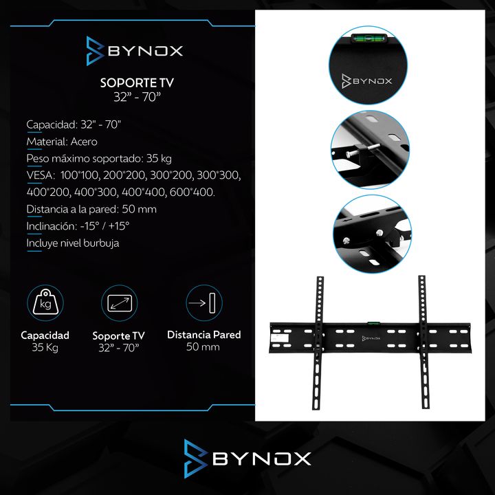 Soporte TV Bynox Basculante 32 a 70 AI-SOPTVB-70 Material: Acero Peso máximo soportado: 35 kg VESA: 100*100, 200*200, 300*200, 300*300, 400*200, 400*300, 400*400, 600*400 Distancia a la pared: 50 mm Inclinación: -15° / +15° Incluye nivel burbuja Garantía 6 meses
