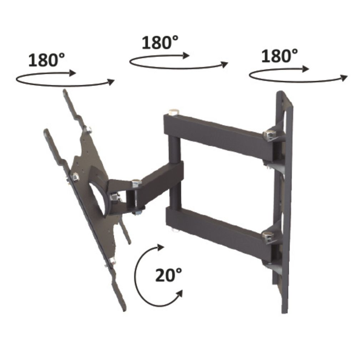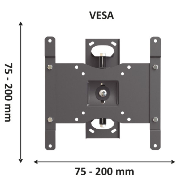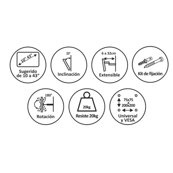 <p><em>- Inclinación: 25 grados</em><br /><em>- Rotación: 180 grados</em><br /><em>- Incluye Nivel Burbuja + kit de fijación</em><br /><em>- Resiste: 20kg</em><br /><em>- Universal y VESA: 50x50 a 200x200</em><br /><em>- Distancia a pared: 6 a 32cm</em><br /><br /><em>- Origen: ...