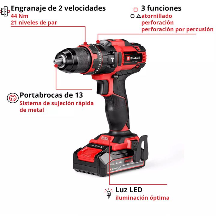 El taladro percutor con batería TE-CD 18/44 Li-i (1x2,0 Ah) de Einhell es un todoterreno para cualquier aficionado al bricolaje. Como miembro de la potente familia Power X-Change puede combinarse con todas las baterías y cargadores de la serie del sistema. El robusto engranaje de 2 velocidades es ap...