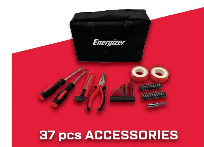 TALADRO ATORNILLADOR DE MANO INALAMBRICO ENERGIZER EZLCD12VK + 37 ACCESORIOS El taladro atornillador EZPV12V está equipado con 2 baterías de 12VCada batería tiene una potencia de 2Ah. Las baterías son de tecnología de litio de última generación, la más eficiente: más ligera que las baterías convenci...