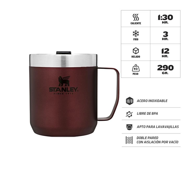 Taza térmica Stanley Clásica Camp Mug 354ml - ATENCIÓN: la tapa no es 100% hermética, cuenta con una boquilla abierta para beber. Especificaciones: - Conserva bebidas calientes por 1,5 hs, frías 3hs - Hielo 15hs - 18/8 acero inoxidable; libre de BPA. - Aislamiento de doble pared al vacío. - Apto lav...