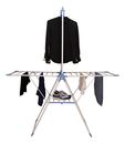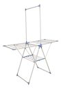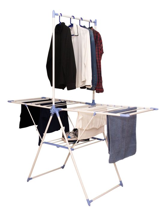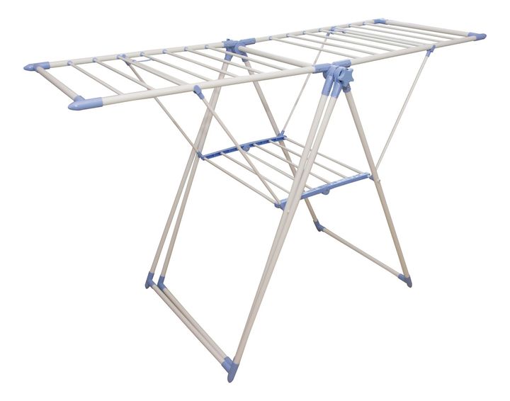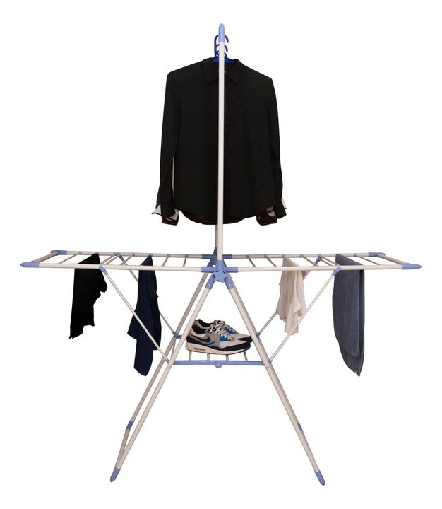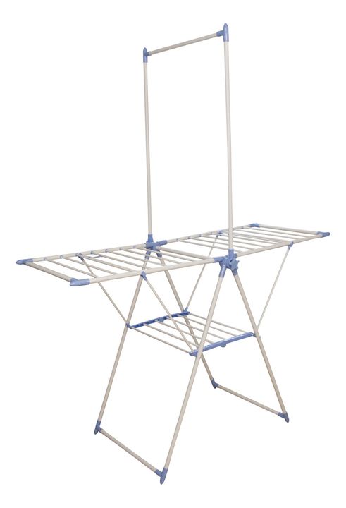 HOGAR ACTUAL TENDER DE PIE C/ COLGADOR DE PERCHAS SKU: 142957 TENDEDERO DE PIE ACERO ULTRA LIVIANO CON COLGADOR DE CAMISAS Modelo: 142957 Color Blanco con partes plásticas en celeste • Plegable • Práctico y liviano • Con colgador de perchas para camisas • Con rejilla para apoyar las zapatillas • Est...