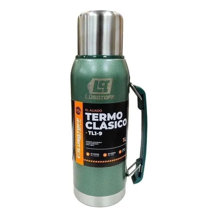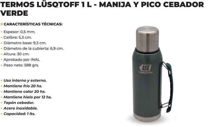TERMO + MANIJA Y PICO CEBADOR - Capacidad: 1 litro - Mantiene el frio por 20 hs - Mantiene el calor por 20 hs - Mantiene el hielo por 12 hs - Tapón cebador - Espesor: 0,5 mm - Calibre: 5,3 cm - Diámetro base: 9,3 cm - Diámetro de la cubierta: 6,9 cm - Altura: 30 cm - Aprobado por INAL - Peso neto: 5...