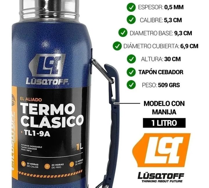 Termo Acero Inoxidable Lusqtoff Manija 1lt Frio Calor Tl1-9A TL1-9A ¿Necesitás el complemento perfecto para tu kit matero? Experimentá la calidad de este termo Lüsqtoff con el que vas a poder disfrutar de cualquier infusión. Llevalo a donde quieras y tené listo tu café, té, o jugo rápidamente. La te...