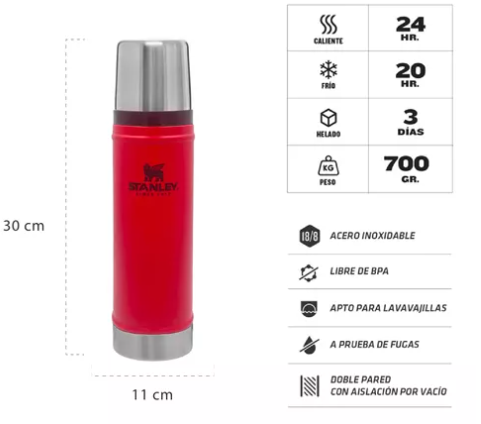 TERMO STANLEY CLASSIC 591 ML 24HS CALIENTE CON TAPON CEBADOR 10-10294-030 Este pequeño termo resistente está diseñado para soportar cualquier cosa (golpes, abolladuras e incluso caídas), todo mientras conserva la integridad térmica de su bebida favorita. Es delgado para que pueda agarrarlo con una s...