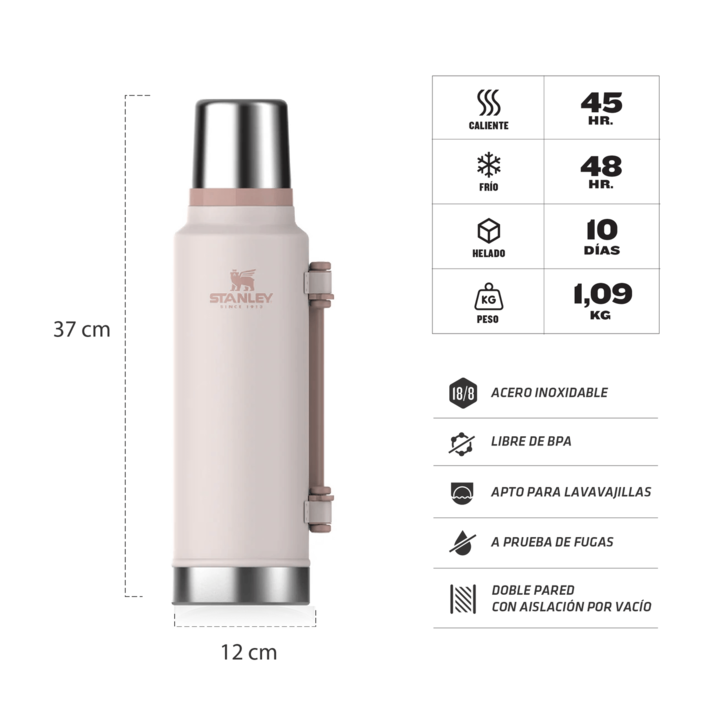La palabra que viene a la mente es icónico: diseño elegante, construcción robusta y una actitud indescriptible. Totalmente a prueba de fugas y capaz de mantener las bebidas calientes durante 40 horas, frías durante 45 horas o con hielo durante 6 días. Con el termo Stanley nunca tendrás que preocupar...