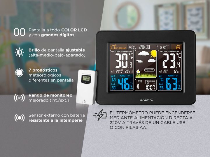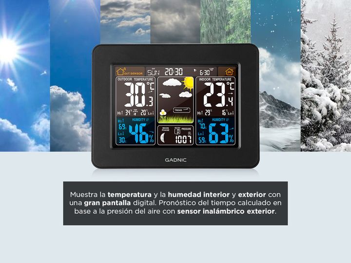Una pantalla para capturar la dinámica climática deseada: 7 pronósticos meteorológicos (soleado, nublado, nublado, lluvia ligera, lluvia intensa, nieve ligera, nieve intensa) y pantalla de tendencias meteorológicas Pantalla de humedad alta/baja, visualización de índices meteorológicos múltiples, cui...