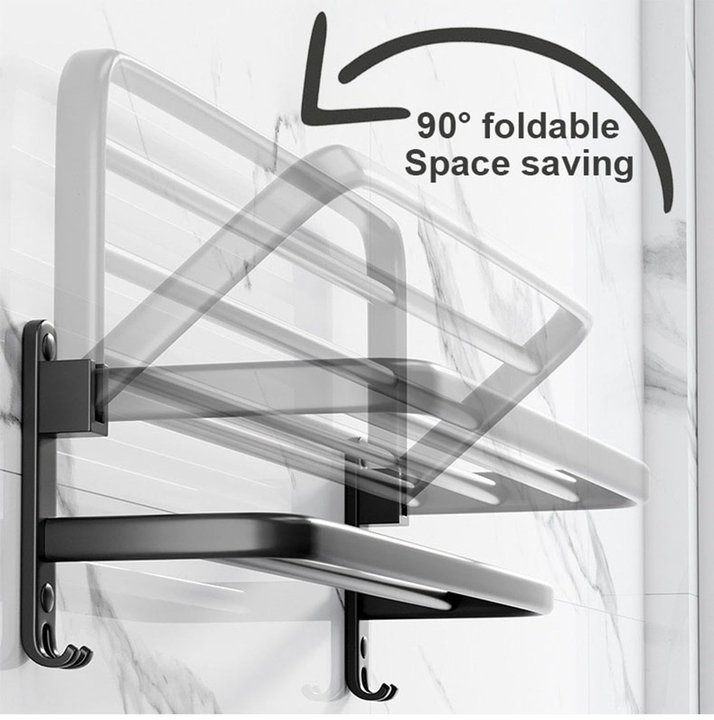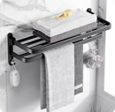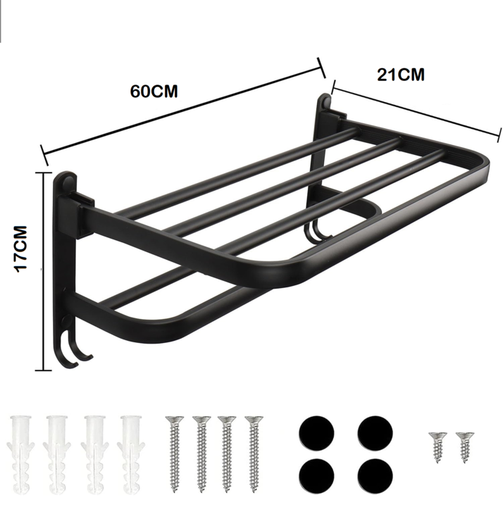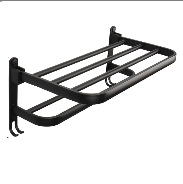 HOGAR ACTUAL TOALLERO DE ALUMINIO NEGRO SKU: 142283 Toallero rebatible de Aluminio Color Negro • Material: Aluminio Negro • Toallero, repisa, porta toalla • Para prendas y toallas • La repisa de arriba puede sostener varias toallas y toallones doblados • La parte superior es plegable 90° hacia arrib...
