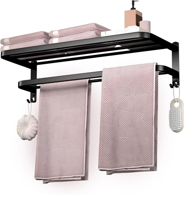 HOGAR ACTUAL TOALLERO DE ALUMINIO NEGRO SKU: 142283 Toallero rebatible de Aluminio Color Negro • Material: Aluminio Negro • Toallero, repisa, porta toalla • Para prendas y toallas • La repisa de arriba puede sostener varias toallas y toallones doblados • La parte superior es plegable 90° hacia arrib...