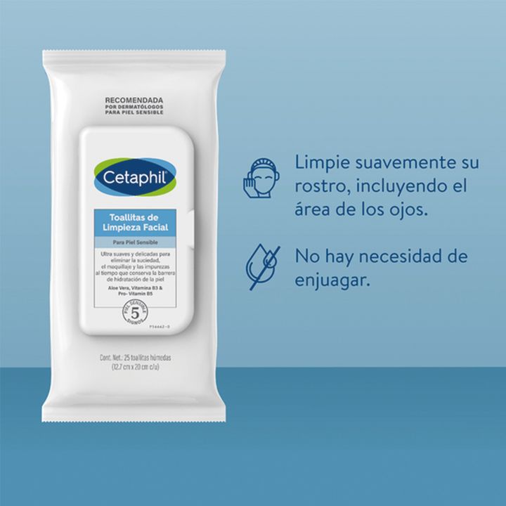 Toallitas Cetaphil Limpieza Facial X 25 Pieles Sensibles Cetaphil Toallitas de Limpieza Facial INFORMACIÓN DEL PRODUCTO Toallitas desmaquillantes ultra suaves, remueven impurezas sin necesidad de enjuague. Pre-humectadas con ingredientes que remueven maquillaje resistente al agua. Con ingredientes s...