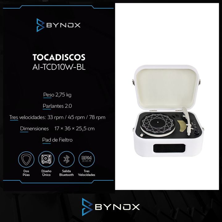 Tocadiscos Bynox con BTH - Cabezal Cerámico AI-TCD10W-BL El Tocadiscos Bynox con BTH no solo ofrece un sonido espectacular, sino que también añade un toque de elegancia y modernidad a cualquier espacio con su diseño exclusivo. Con múltiples opciones de conectividad, un diseño elegante y una calidad ...