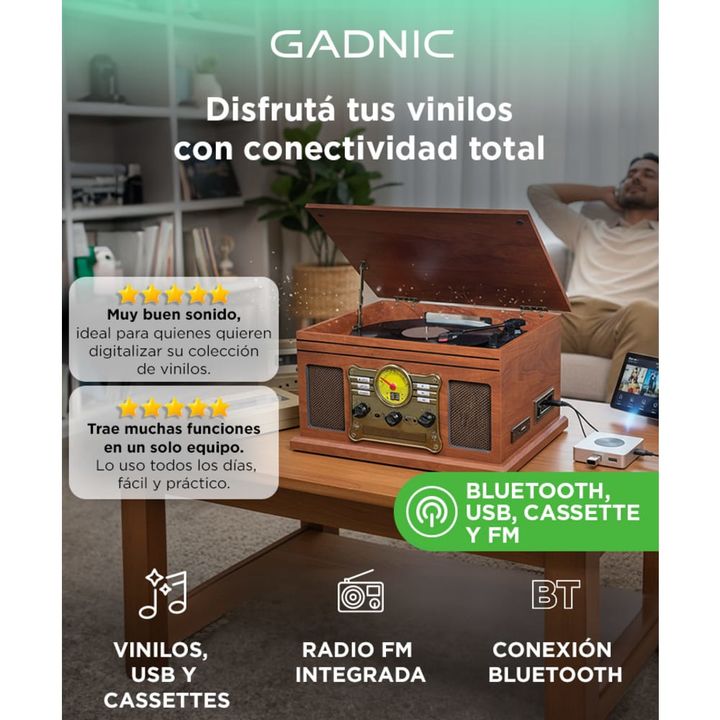 El tocadiscos Gadnic combina lo clasico en su diseño con lo moderno en sus funciones, ideal para los amantes de la música. Incluye tecnología Bluetooth incorporada para transmitir música de forma inalámbrica desde cualquier dispositivo habilitado, al mismo tiempo podes concentrarte escuchando tu mus...