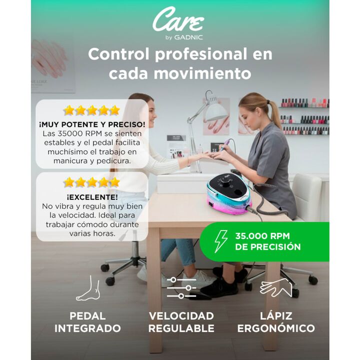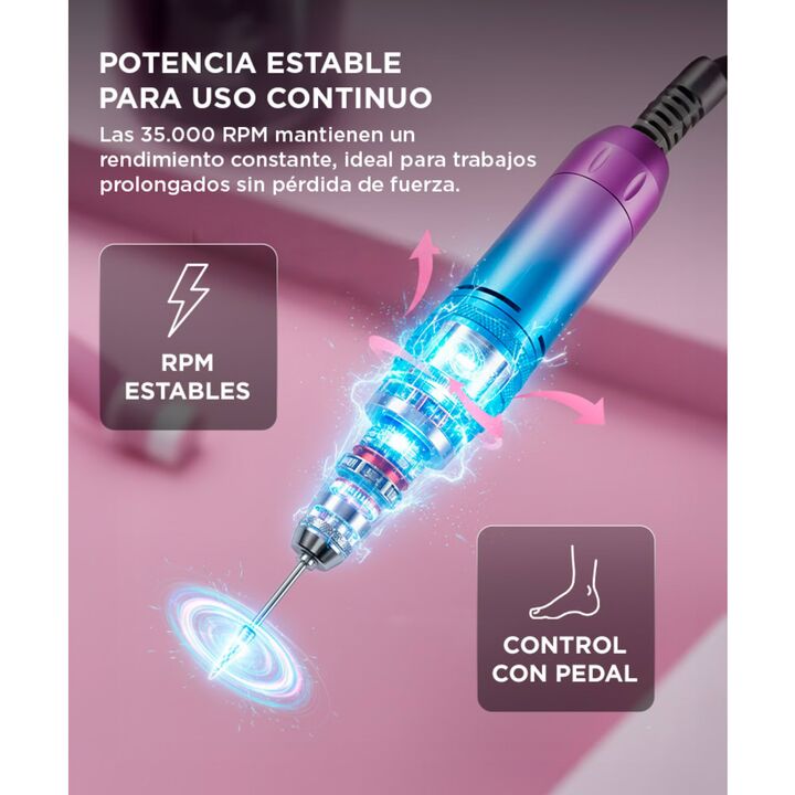 ¡Descubre la herramienta perfecta para lograr unas uñas impecables en la comodidad de tu hogar o salón de belleza! Presentamos nuestro Torno para Uñas de 35000 rpm, diseñado para brindarte un control preciso y resultados profesionales. Con una velocidad ajustable de hasta 35000 revoluciones por minu...