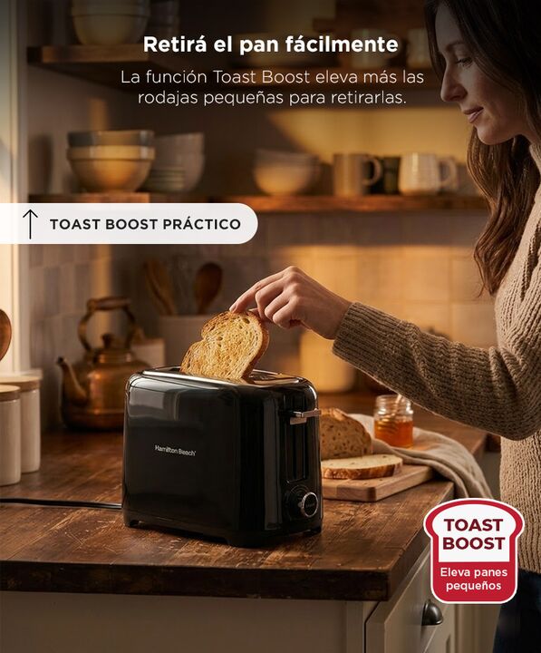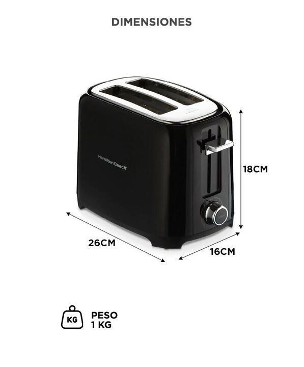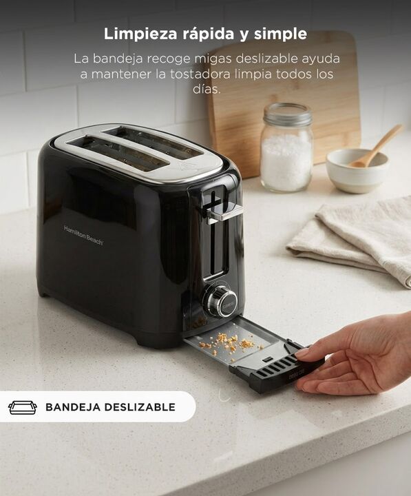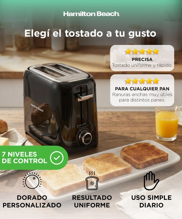 Tostadas Perfectas Todos Los Dias La tostadora Hamilton Beach esta diseñada para preparar tostadas de forma rapida y uniforme en el hogar. Su potencia de 800W permite lograr un tostado eficiente en pocos minutos. Las ranuras profundas y anchas permiten colocar distintos tipos de pan incluyendo bagel...