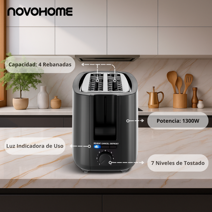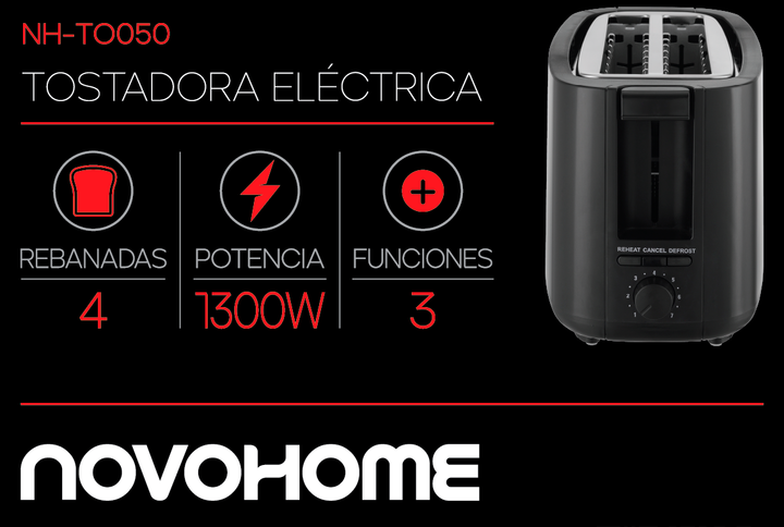 NOVOHOME TOSTADORA NEGRA 4 BAHÍAS 1300W SKU: NH-TO050 DESAYUNOS FAMILIARES Y DELICIOSOS EN UN TOQUE La tostadora Novohome de 4 rebanadas es una herramienta versátil y práctica para cualquier cocina, diseñada para facilitar el desayuno y hacer de cada mañana una experiencia perfecta. Capaz de tostar ...