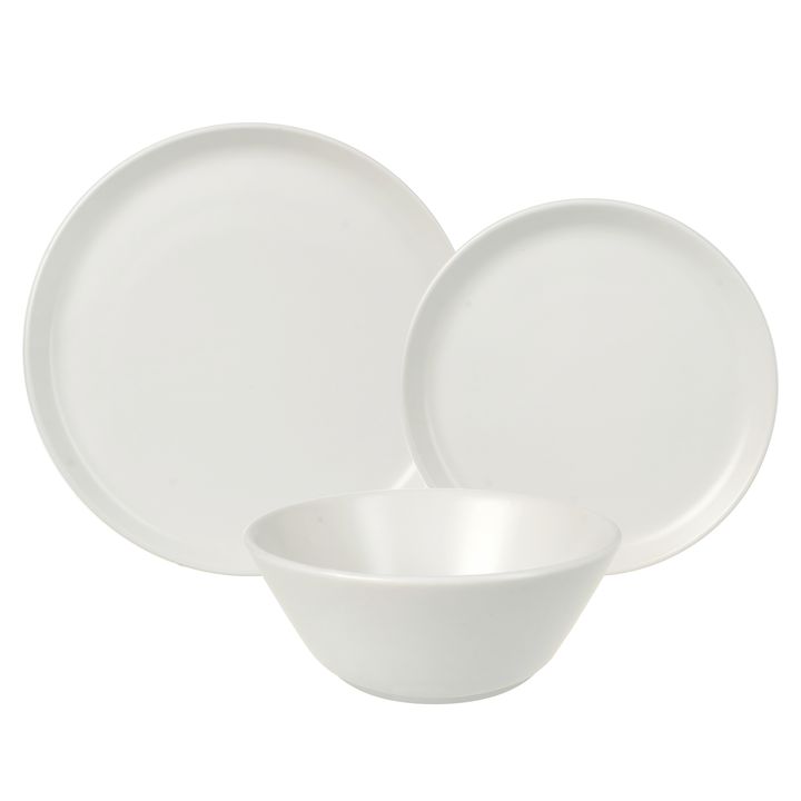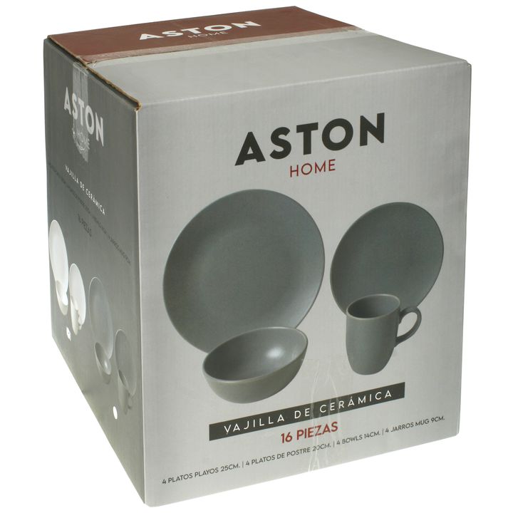 Set de vajilla de ceramica en color Blanco Mate o Gris Mate. Compuesto por : - 4 platos playos de 25 cms , Altura : 2,5 cm - 4 platos postre de 20 cm , Altura : 2 cm - 4 bowls de 14 cm , Altura : 5,5 cm - 4 Jarros Mug de 10 cm , Diametro boca : 7,6 cm , Capacidad : 280 ml Terminacion MATE ( no tiene...