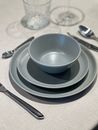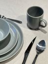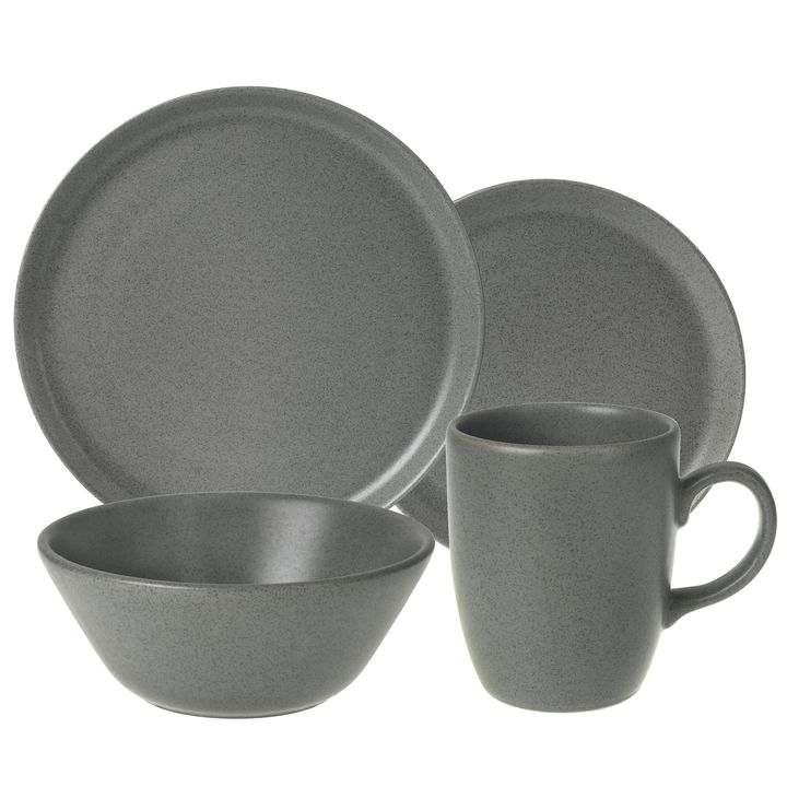 Set de vajilla de ceramica en color Gris Mate. Compuesto por : - 4 platos playos de 25 cms , Altura : 2,5 cm - 4 platos postre de 20 cm , Altura : 2 cm - 4 bowls de 14 cm , Altura : 5,5 cm - 4 Jarros Mug de 10 cm , Diametro boca : 7,6 cm , Capacidad : 280 ml Terminacion MATE ( no tiene brillo) Ceram...