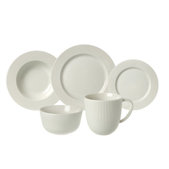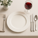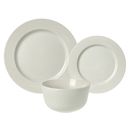 Juego de Vajilla formado por 18 piezas de porcelana color Hueso. Contiene : - 6 platos playos de 28 cms de diametro. Borde guarda de 4,2 cms con lineas ( estriada) - 6 platos postre de 22 cms de diametro .Borde guarda de 3,2 cms con lineas guarda estriada - 6 bowls de 13 cms de diametro / Altura : 7...