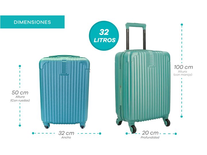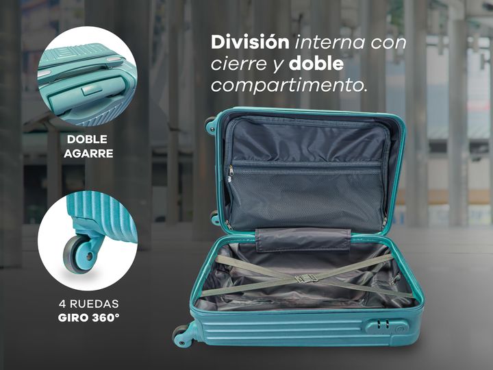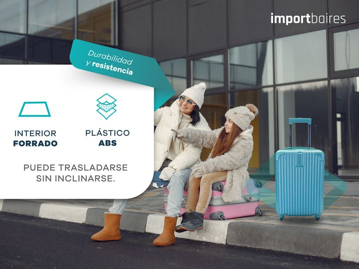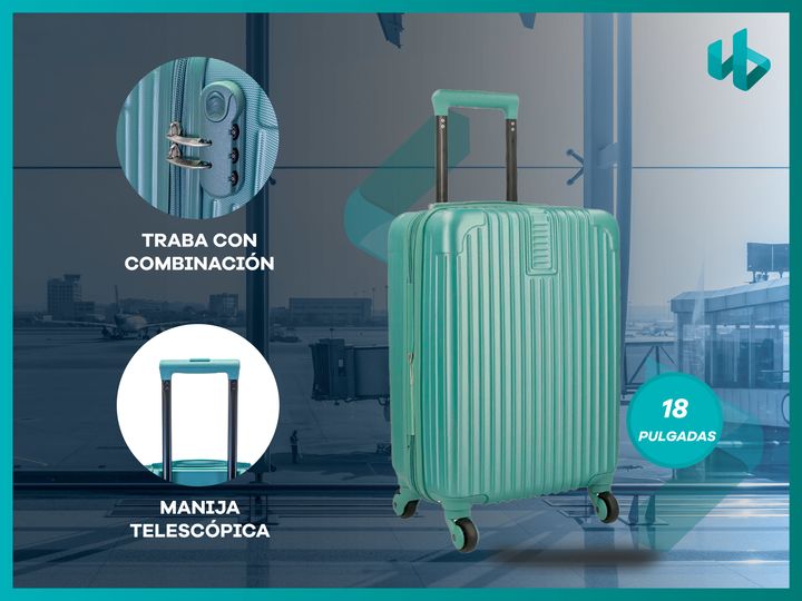 VALIJA 18 CHICA DE CABINA PLASTICO ABS RIGIDO CON CANDADO DE COMBINACIÓN · Cuatro ruedas de PVC reforzadas en el eje 360° · Cierres reforzados · Ideal para viajes cortos · Elástico interno con traba para sujetar las pertenencias · 100% Plástico ABS · Traba candado con combinación integrada para los ...