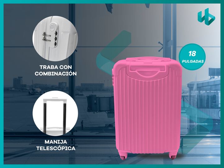 VALIJA 18 CHICA DE CABINA PLASTICO ABS RIGIDO CON CANDADO DE COMBINACIÓN · Cuatro ruedas de PVC reforzadas en el eje 360° · Cierres reforzados · Ideal para viajes cortos · Elástico interno con traba para sujetar las pertenencias · 100% Plástico ABS · Traba candado con combinación integrada para los ...