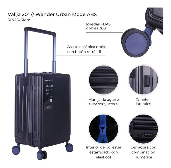 La valija Wander Urban Mode ABS Negro 20 Pulg 39967 es la elección perfecta para quienes buscan un equipaje de mano funcional y elegante. Con un diseño moderno y sofisticado, su material ABS garantiza durabilidad y resistencia, ideal para cualquier tipo de viaje.