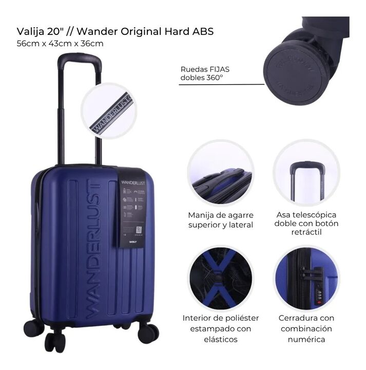 La valija Wanderlust Hard Abs 20 Pulg Expandi en azul oscuro es la compañera ideal para tus viajes. Con un diseño elegante y moderno, su estructura rígida de ABS garantiza durabilidad y resistencia, protegiendo tus pertenencias en cada aventura. Su tamaño de equipaje de mano, con dimens...