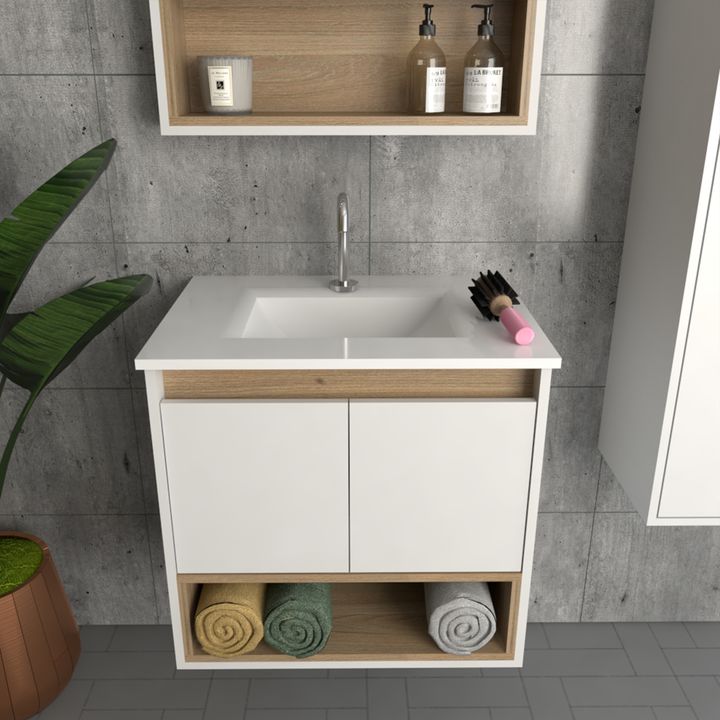 Vanitory de melamina de alta resistencia Línea Toilet. Dos puertas con bisagras metálicas, y un estante. Hueco inferior para guardado. Incluye bacha de cerámica con una perforación. Modelo para colgar. Sistema Minifix. NO incluye grifería. Medidas: Ancho: 0.60 mts. Alto: 0.58 mts. Profundidad: 0.45 ...