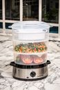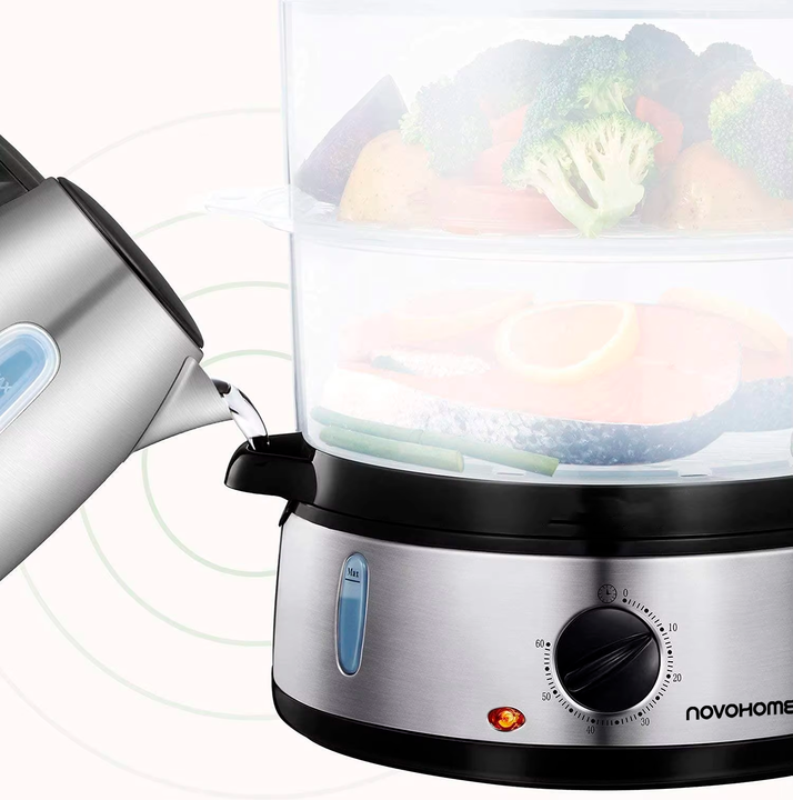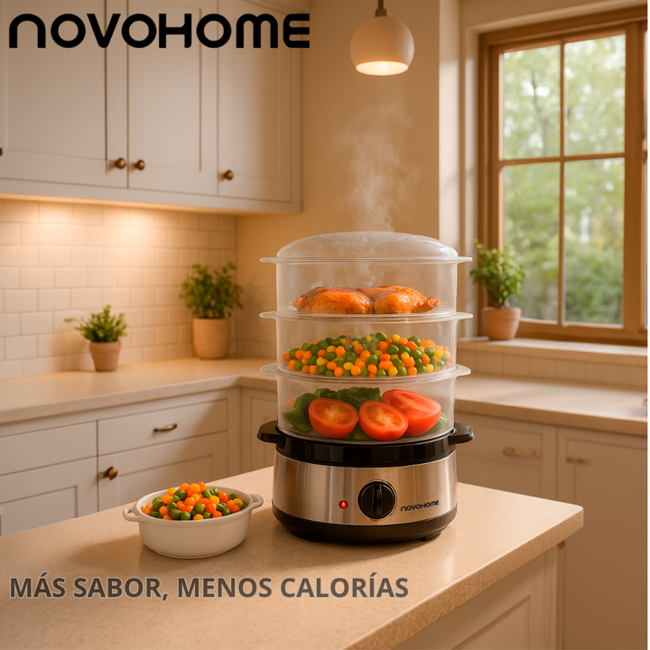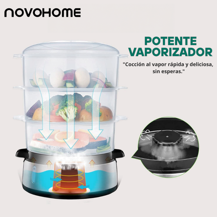 NOVOHOME VAPORERA SKU: NH-VP300 MÁS SABOR, MENOS CALORÍAS Un ingenioso y saludable mecanismo para preparar alimentos al vapor que conserva el máximo de nutrientes y vitaminas. Tres recipientes permiten cocinar al vapor diferentes tipos de alimentos al mismo tiempo, incluido arroz, verduras y pescado...