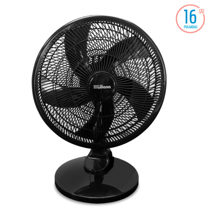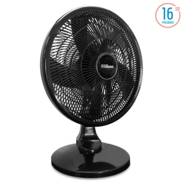 Ventilador de Mesa · Cabezal oscilante y reclinable. · Súper silencioso. · 3 velocidades. · 5 aspas negras. · Base antideslizante. · Diámetro de 16″. · Potencia: 65 watts. · Medidas: 48,5x15x65,5 cm. Garantía 2 Años Industria Argentina