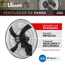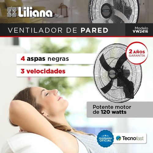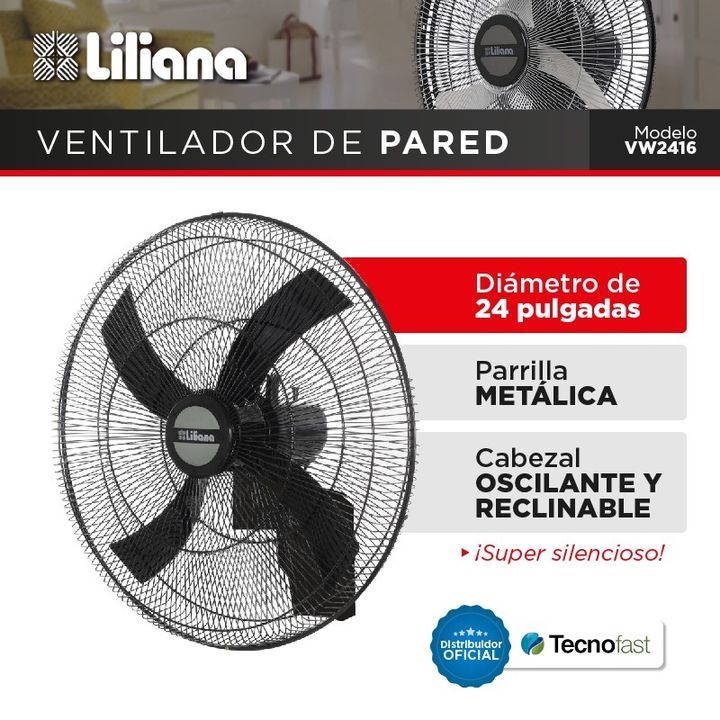 VENTILADOR DE PARED - Liliana Modelo: VW2416 Características: • Motor con doble rodamiento blindado • High Performance • Especial para zonas de altas temperaturas • Parrilla metálica color negro. • Cabezal oscilante y reclinable. • 4 aspas negras. • Súper silencioso. • 3 velocidades. • Diámetro de 2...