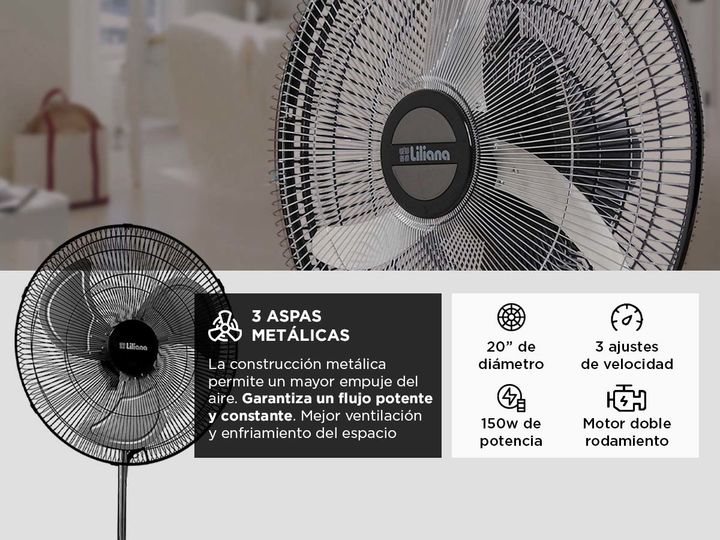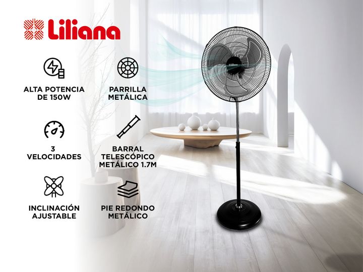 Liliana presenta el nuevo Ventilador de Pie 20 VP20POW Parrilla metálica con Cabezal reclinable: Diámetro de Aspas 20: El tamaño permite una amplia cobertura de aire, ideal para refrescar habitaciones grandes o espacios abiertos. Las aspas están diseñadas para maximizar el flujo de aire y minimizar ...