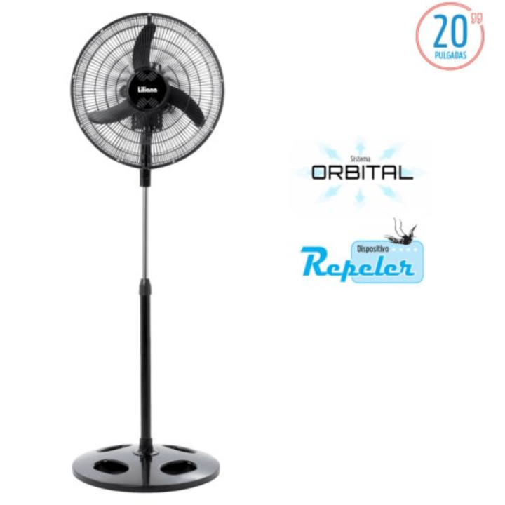 Ventilador de Pie Orbital con Repeller · Barral telescópico extensible metálico. Altura máxima 1,70 mts. · 3 aspas negras. · Parrilla metálica negra. · Base redonda. · Súper silencioso. · 3 velocidades. · Diámetro de 20″. · Potencia: 90 vatios. · Medidas: 57,4x16x75,5cm. Sistema orbital Dirija la br...