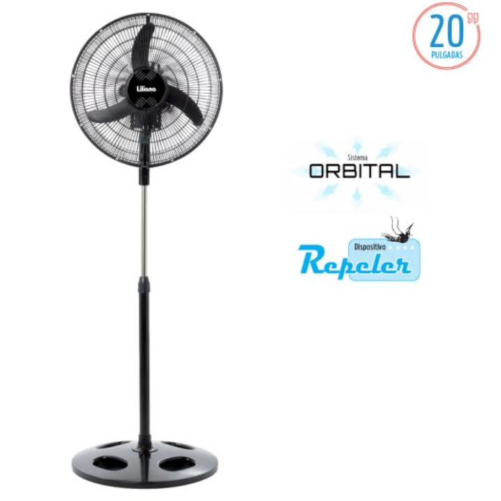 Ventilador de Pie Liliana 20″ 90W 3 velocidades 3 aspas y parrilla metálica – VPRN20 · Barral telescópico extensible metálico. Altura máxima 1,70 mts. · 3 aspas negras. · Parrilla metálica negra. · Base redonda. · Súper silencioso. · 3 velocidades. · Diámetro de 20″. · Potencia: 90 vatios. · Medidas...