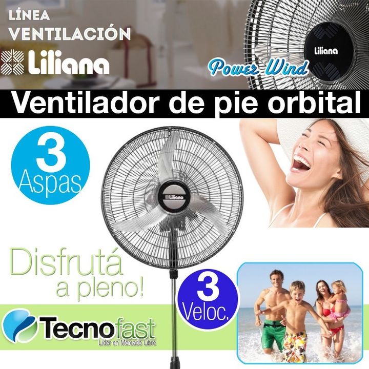 VENTILADOR DE PIE ORBITAL 20 - Liliana Modelo: VVPM2016 Características • Barral telesco´pico meta´lico de 1,70 m. • 3 aspas metálicas. • Parrilla meta´lica negra. • Base redonda. • Super silencioso. • 3 velocidades. • Diámetro de 20. • Potencia: 90 watts. • Sistema Orbital: Direcciona la brisa en f...