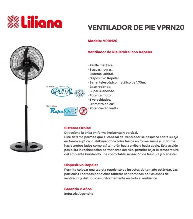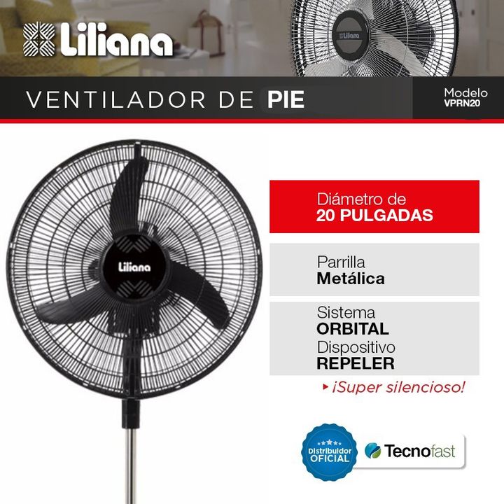 VENTILADOR DE PIE - Liliana Modelo: VPRN20 Caracteristicas • El ventilador de pie Liliana VPRN20 viene con parrilla metálica y 3 aspas plásticas de color negro. • Su cabezal inclinable de 20 pulgadas (50.8 cm.) de diámetro cuenta con Sistema Orbital, que direcciona la brisa en forma horizontal y ver...