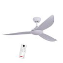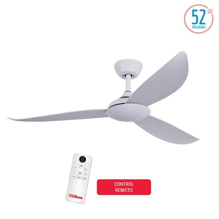 · Diámetro: 1.32 m (52”). · Velocidad máxima: 210 RPM. · 3 palas plásticas blancas. · 6 velocidades. · Giro reversible. · Control remoto. · Timer programable: (1hs/4hs/8hs). · Motor DC. Potencia 40 w.