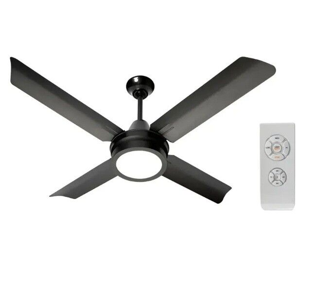 Ventilador de techo con palas de madera MDF (Medium Density Fibreboard) foliado, color cedro y haya, con tapa de acero color dorado. Palas reversibles. Con luminaria led.