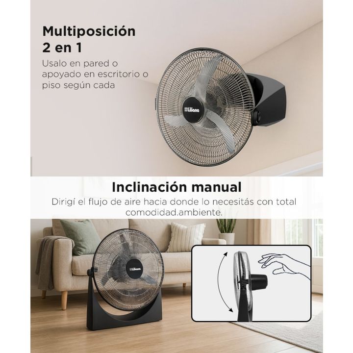 Potencia turbo de alto caudal: Su sistema de aspas metálicas de 18 genera un flujo de aire intenso, ideal para refrescar ambientes rápidamente. Diseñado para uso continuo sin perder rendimiento. Multiposición 2 en 1: Podés instalarlo en pared o apoyarlo en escritorio o piso, adaptándose a cualquier ...