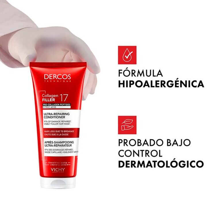 Vichy Dercos Acondicionador Ultra-Reparador Collagen 17 es un tratamiento acondicionador formulado para combatir la caída del cabello por rotura, fortaleciendo la fibra capilar desde el interior. Su tecnología avanzada ayuda a reparar hasta 17 signos de daño capilar, logrando un cabello visiblemente...