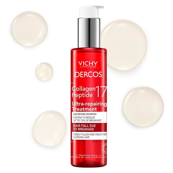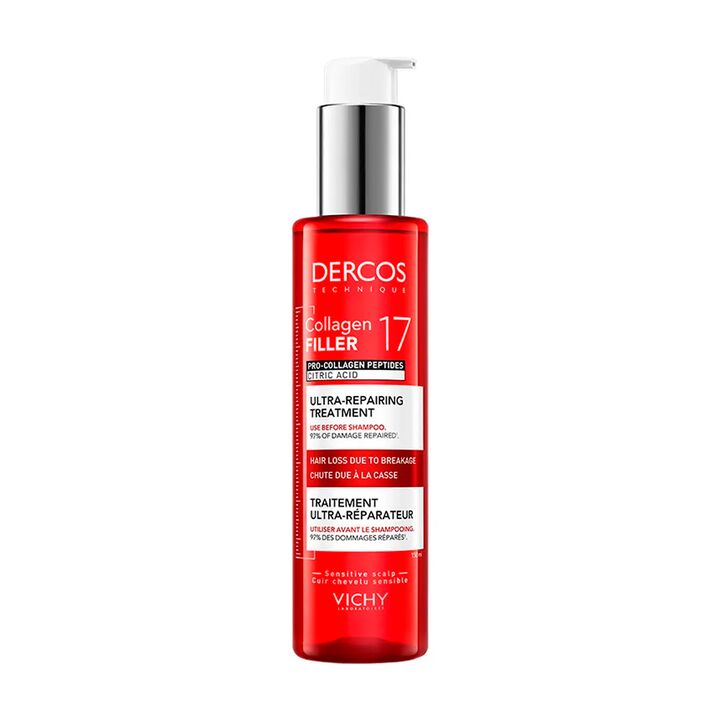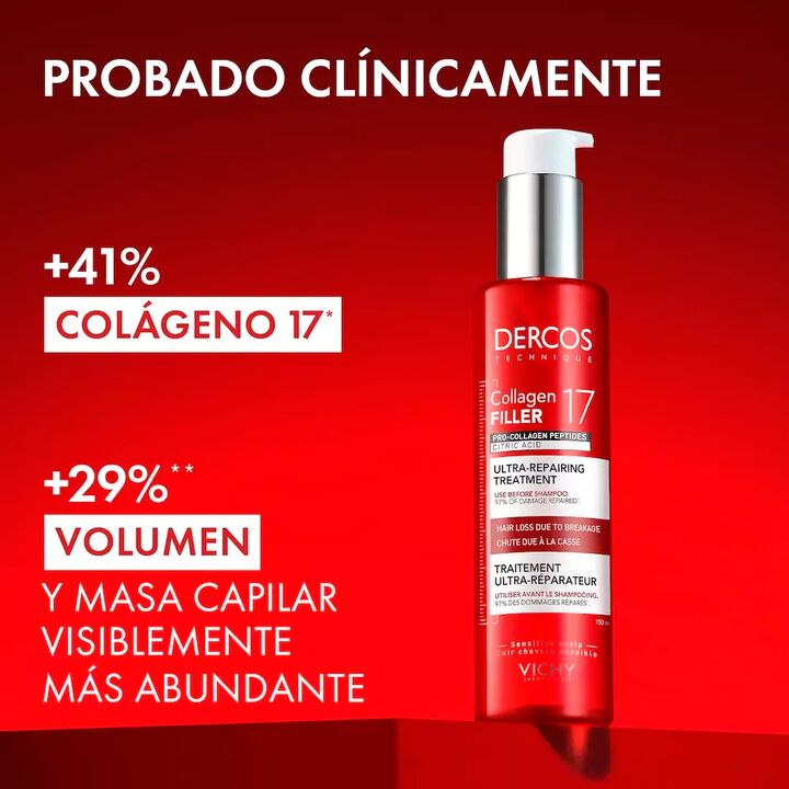 Vichy Dercos Pre-Shampoo Ultra-Reparador Collagen 17 es un tratamiento intensivo diseñado para fortalecer el cabello antes del lavado y combatir la caída por rotura desde la raíz. Su fórmula dermocosmética combina ácido cítrico, un AHA de alta penetración, y péptidos de colágeno biosintético que ayu...
