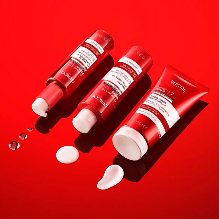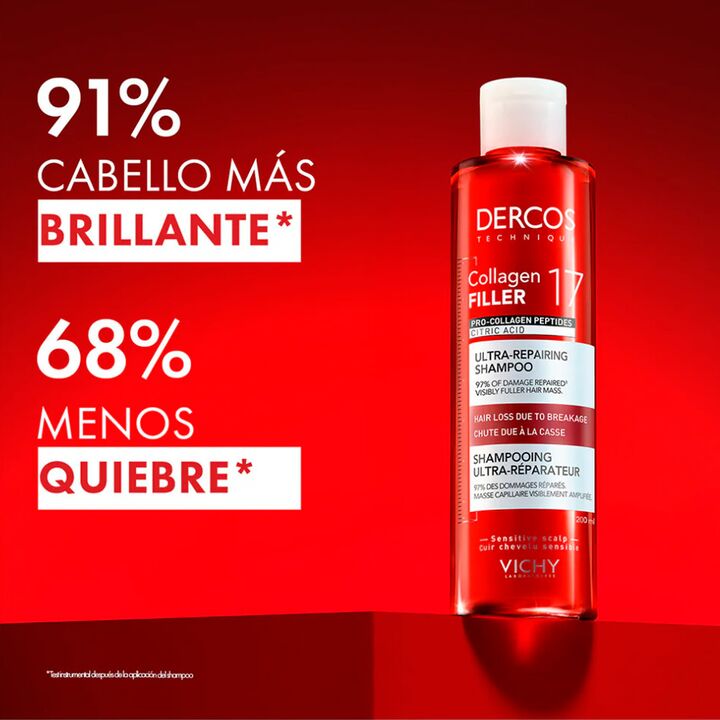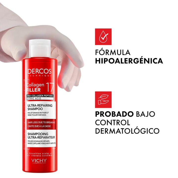 Vichy Dercos Shampoo Ultra-Reparador Collagen 17 es un shampoo dermocosmético formulado para fortalecer el cabello debilitado y reducir la caída por rotura. Su fórmula avanzada combina ácido cítrico, un AHA capaz de penetrar la fibra capilar, y péptidos de colágeno biosintético que ayudan a recrear ...