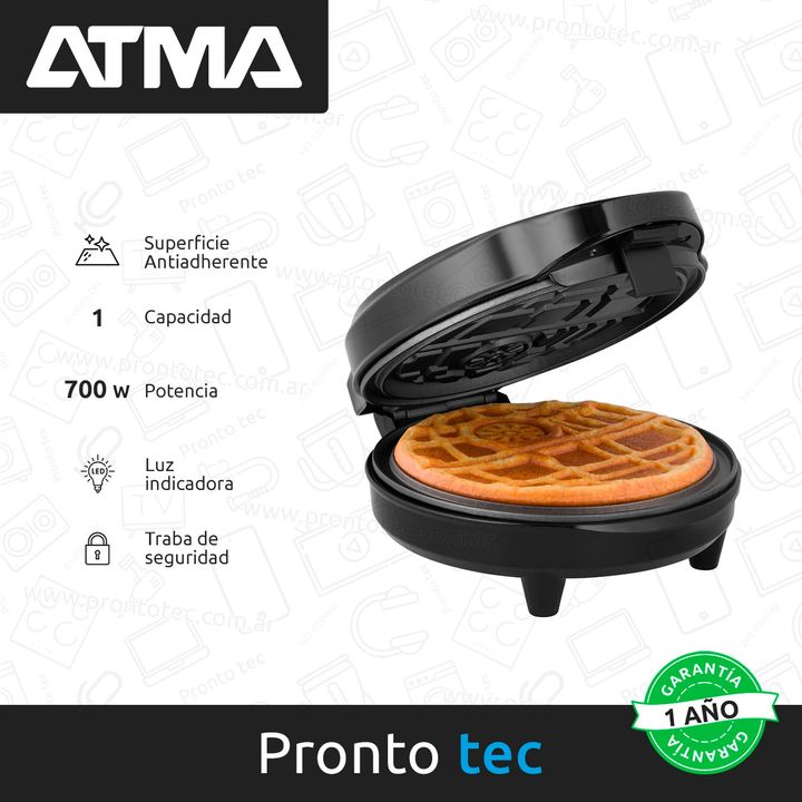 CARACTERÍSTICAS: - Marca: Atma - Modelo: WS027DRN - Potencia: 700 W - Capacidad: 1 waffle - Luz indicadora: Si - Placas antiadherente: Si - Traba de seguridad: Si - Timer: No - Enrrollacable: Si CONTENIDO DE LA CAJA: - Manual de Usuario