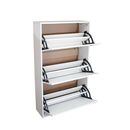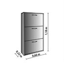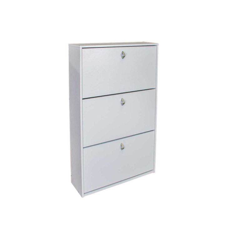 Zapatero de melamina. Tres puertas batientes. Capacidad para 18 pares, con separadores interiores. Herrajes de Pvc. Medidas: Ancho: 0.66 mts. Alto: 1.18 mts. Profundidad: 0.22 mts.