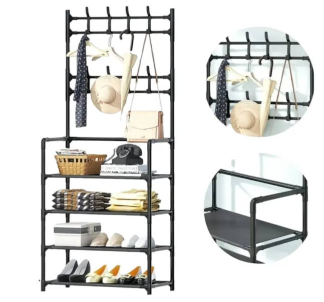 Mantén tu hogar ordenado con este práctico organizador de 5 niveles con colgador superior. Ideal para la entrada, dormitorio o vestidor. Su diseño versátil combina espacio para colgar prendas y bolsos con estantes para zapatos, ropa doblad...
